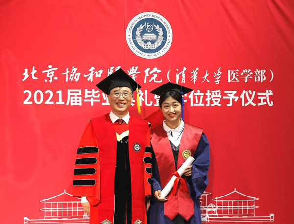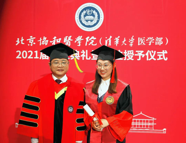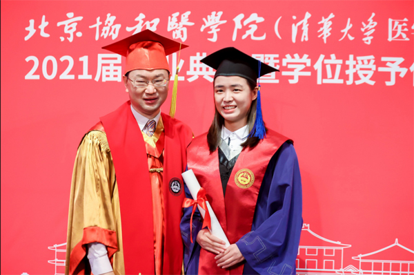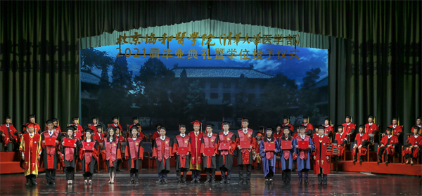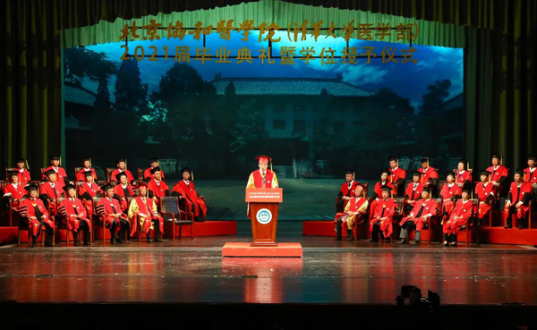 2021届优秀毕业生代表身着学位服,手持奖牌缓缓步入会场,重现百年协和毕业典礼的经典场景,象征协和精神与血脉的赓续传承。
