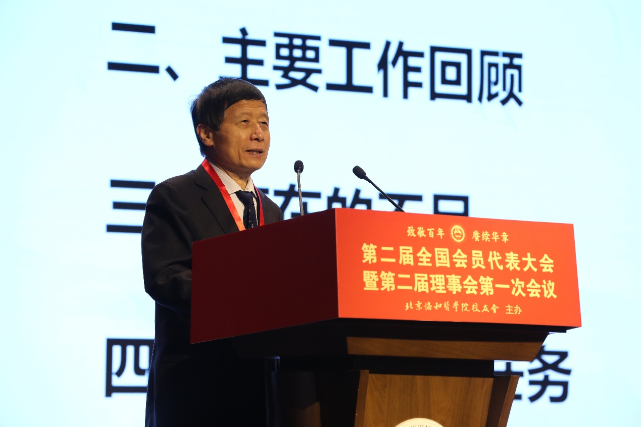 王辰院校长致开幕辞,介绍了院校各项事业在新百年取得的新进展。他指出,院校近年来积极探索医学教育教学改革,肇启“4+4”高层次医学人才和“4+2”卓越护理人才培养模式;不断强化公共卫生教育,设立群医学及公共卫生学院和卫生健康管理政策学院;率先实施医学类准聘长聘教职聘任改革,引育并举,吸引有才华的高层次人才进入教职岗位;深入优化学科建设,形成了医学、护理、药学和公共卫生四大优势学科;整合区域优质研究力量,加快推进开放型国家医学科技创新体系建设。他强调校友会要积极联络校友、服务校友,宣传院校,拓展和凝聚资源,为院校发展提供支撑。他勉励广大校友和院校师生员工,坚持面向人民生命健康,勇担协和人的责任使命,为人民健康、医学科学事业和医学教育事业发展作出更大贡献。