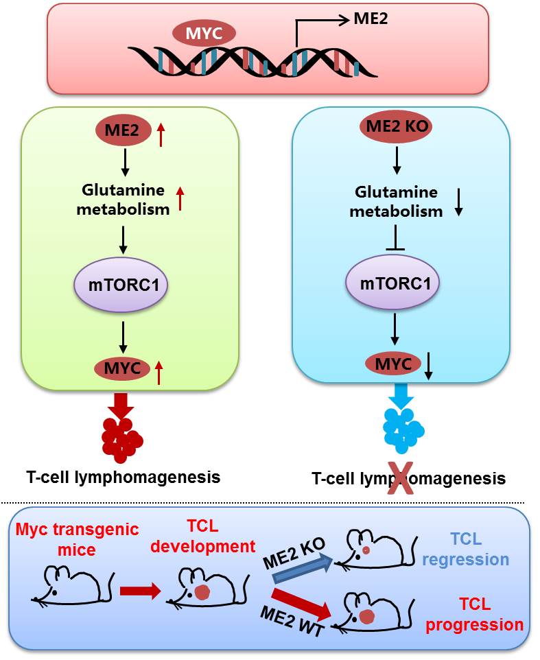 T细胞淋巴瘤(TCL)是一组罕见的、高异质性的肿瘤。尽管原癌基因MYC在驱动T细胞淋巴瘤发生方面有重要作用,然而,目前仍不清楚MYC是如何发挥作用促进T细胞淋巴瘤发生的。苹果酸酶是依赖NADP+(NAD+)的酶,它通过将苹果酸氧化成丙酮酸和NADPH(NADH),连接了谷氨酰胺代谢和葡萄糖代谢。在该研究工作中,本研究团队首先发现苹果酸酶2(ME2)在多数T细胞淋巴瘤(TCL)细胞系以及组织中呈现特异性高表达的现象。通过在CD4启动子的控制下在T细胞中过量表达MYC建立了T细胞淋巴瘤小鼠模型(CD4-Cre;Mycfl/+mice),发现大约90%的小鼠发生TCL,同时也呈现ME2上调表达的现象。有趣的是,在该转基因小鼠中敲除ME2几乎完全抑制了小鼠TCL的发生,说明ME2在MYC驱使的TCL中具有重要作用。为了弄清楚ME2在MYC驱动的TCL中的作用,研究人员分别进行了体内及体外的分子机制研究。发现MYC可以上调ME2的表达,通过ME2介导的谷氨酰胺代谢维持细胞内的氧化还原平衡,从而促进T细胞淋巴瘤产生;反过来,ME2通过调节谷氨酰胺代谢刺激mTORC1活性,从而促进MYC蛋白的翻译;揭示了在谷氨酰胺代谢和TCL的氧化还原维持中ME2和MYC之间存在一种正反馈调节环路。最后研究人员发现利用雷帕霉素(mTORC1抑制剂)处理小鼠可以有效阻断小鼠TCL的发展。