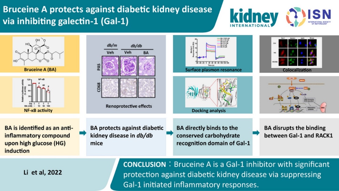 2022年5月19日,beat365手机版官网医药生物技术研究所王真团队在肾脏病研究领域权威杂志Kidney International在线发表了题为“Bruceine A protects against diabetic kidney disease via inhibiting galectin-1”的研究论文。该研究发现提取自中药鸦胆子的苦木素类单体鸦胆子素A具有良好的体外抗炎作用及体内抗炎和抗糖尿病肾病的保护作用。