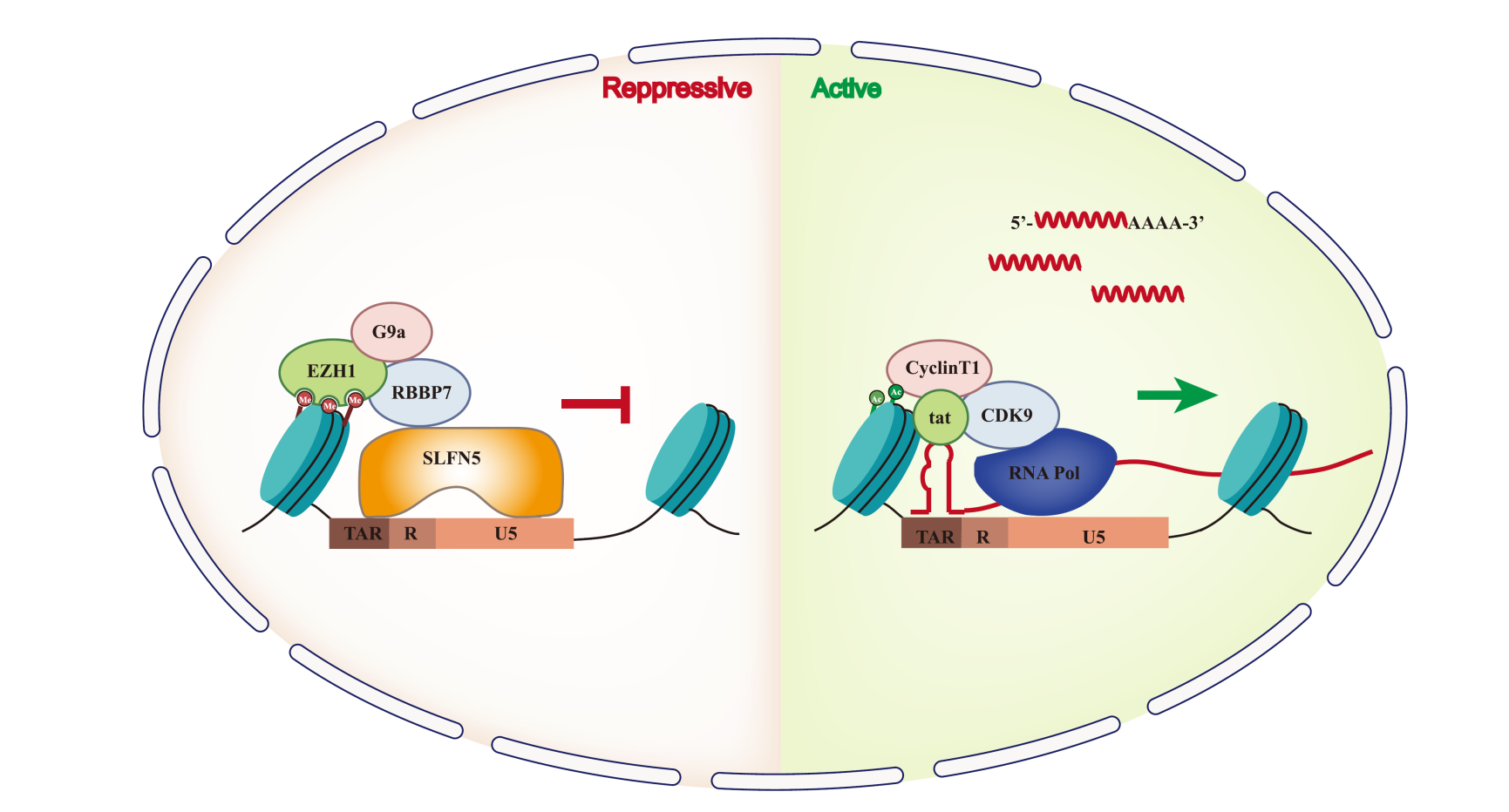 Schlafen-5(SLFN5)是干扰素诱导的Schlafen家族蛋白成员之一,参与免疫反应和肿瘤发生等生物学功能。本研究团队发现了SLFN5的表达水平与艾滋病病毒(HIV-1)的复制密切相关。实验表明,SLFN5可以识别HIV-1的启动子区,显著降低HIV-1长端重复序列(LTR)的转录活性,从而抑制RNA聚合酶II在转录起始点的募集。进一步研究发现,SLFN5与PRC2复合体的成分G9a以及组蛋白H3相互作用,促进组蛋白H3第27位赖氨酸残基的二甲基化和三甲基化(H3K27me2、H3K27me3)的修饰,从而抑制HIV-1的转录,阻止潜伏的HIV-1的激活。上述研究提示SLFN5是一种固有免疫效应分子,是机体对病毒感染的控制机制之一。