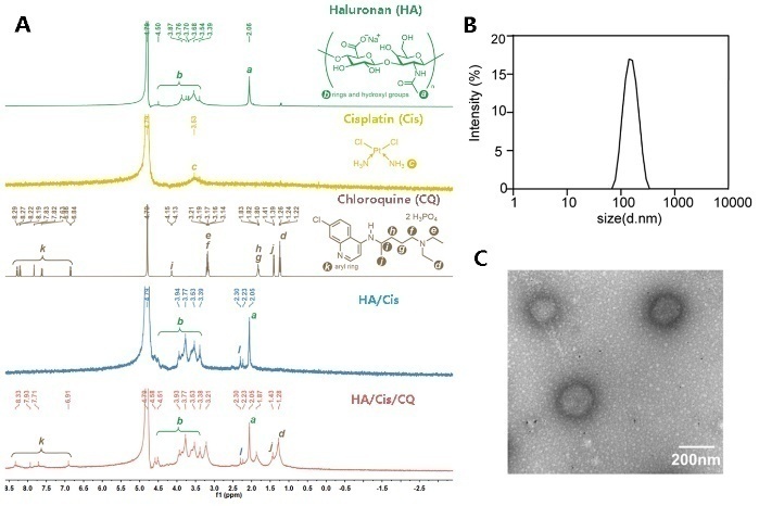 图1. HA/Cis/CQ纳米凝胶的制备与表征。(A)1H NMR分析。(B)HA/Cis/CQ的DLS测试。(C)HA/Cis/CQ的TEM表征。