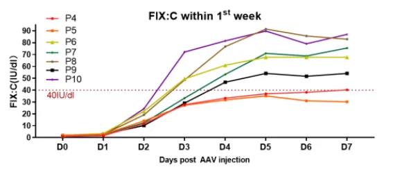 本研究团队历时2年以上,共纳入10例重型/中重型血友病B(FIX:C<2%)患者,一次静脉注射携带有凝血因子IX高活性突变体(FIX Padua)基因的AAV载体,完成中位58(IQR:50-117)周随访,载体衍生FIX:C凝血因子达到平均36.93±20.49IU/dl(图1),其中4例患者FIX:C达到或高于50IU/dl,8例患者高于20IU/dl。前3例患者分别完成了117周、104周和98周随访,FIX:C分别为30.5、31.8和38.5 IU/dl。与国际同类研究相比,本研究中的血友病B基因治疗药物(BBM-H901)起效迅速,载体衍生FIX: C在基因治疗后24h内即可表达,在48h时可达16.27±5.17IU/dl,在一周时为57.12 ± 20.18 IU/dl(均值±SD)(图2),并在中位5(IQR:1,6)周时达到FIX:C最高值64.05 ±22.53 IU/dl(均值±SD)。