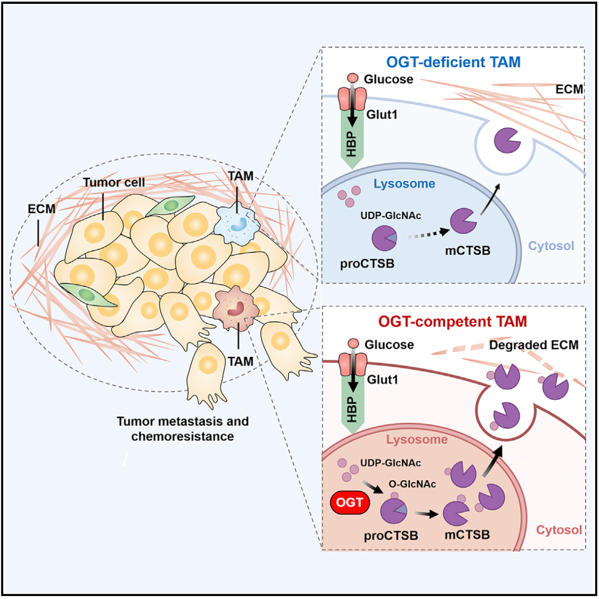 该研究的创新性及生物学意义主要包括:第一,首次揭示了TAM竞争性摄取葡萄糖的病理意义,即TAM竞争性摄取葡萄糖促进HBP和OGT介导的Cathepsin B的O-GlcNAcylation修饰及后续的成熟和分泌,进而促进肿瘤的转移和化疗抵抗;这一发现进一步揭示肿瘤免疫代谢和肿瘤免疫逃逸的新型机制,有助于设计针对TAM葡萄糖吸收、O-GlcNAcylation修饰的肿瘤治疗方法。第二,发现溶酶体定位的OGT可以修饰包括半胱氨酸蛋白酶之类的靶蛋白而调控了溶酶体在肿瘤转移与化疗抵抗中的作用,该发现拓展了我们对OGT、溶酶体生物学功能的认识。第三,首次揭示了翻译后修饰对溶酶体半胱氨酸蛋白酶蛋白水平的调控,有助于进一步探索特殊蛋白在溶酶体中稳定存在的分子机理。总之,在该研究中,研究团队首次阐明了TAM,尤其是M2样TAM竞争性摄取和利用葡萄糖对于塑造细胞特异性促肿瘤功能的重要意义,为肿瘤治疗提供了潜在的靶点。