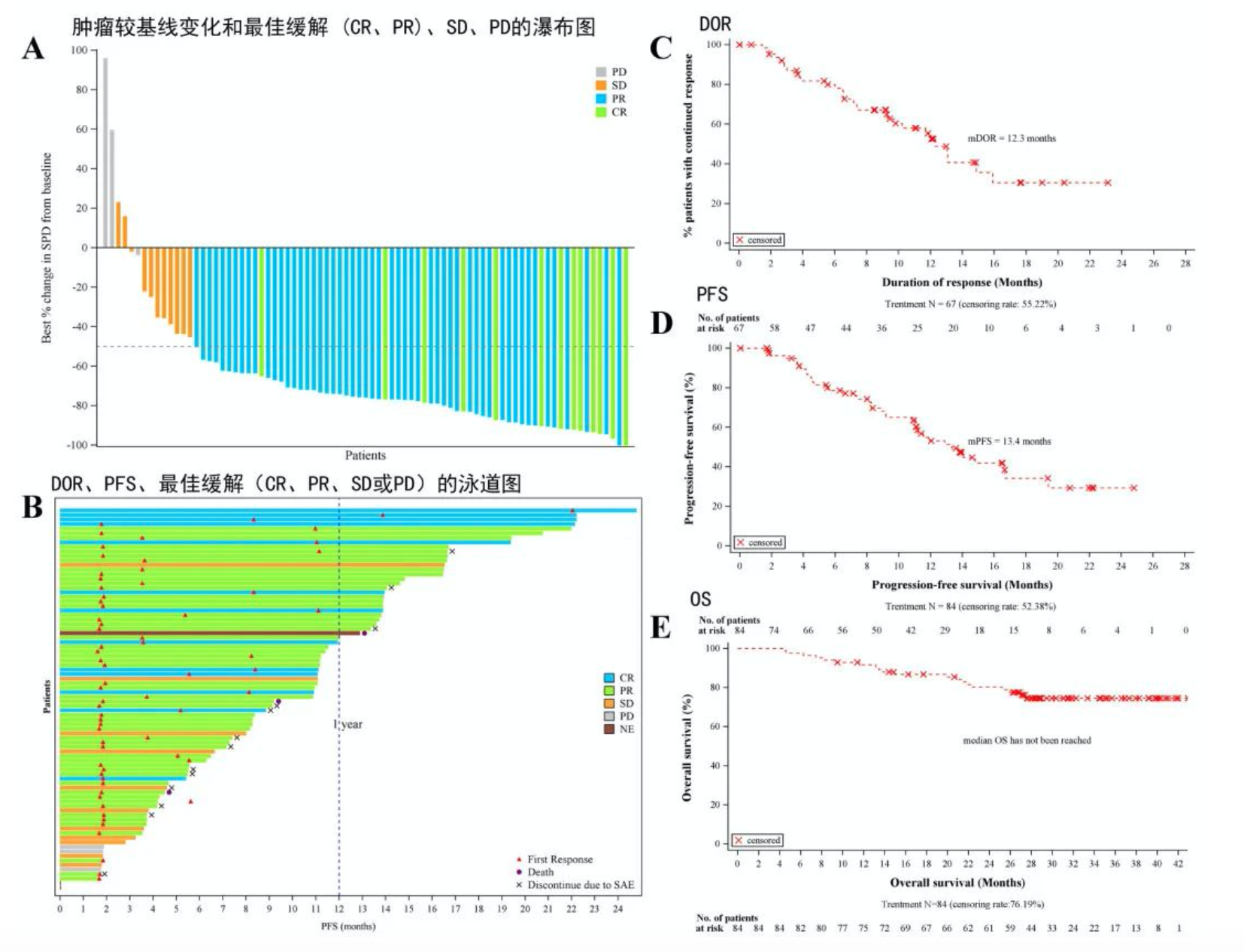 研究纳入经过二线及以上系统治疗后R/R FL。共筛选114例R/R FL患者,其中84例纳入全集分析(FAS)。截至2021年9月30日,中位随访时间16.7个月。独立评审委员会(IRC)评估结果为客观缓解率ORR 79.8%,其中13例患者(15.5%)获得完全缓解(CR),54例患者(64.3%)获得部分缓解(PR),达到缓解的中位时间为1.9个月。中位无进展生存时间(PFS)13.4个月(11.1-16.7个月),中位总生存时间(OS)未达到,已超过42个月。