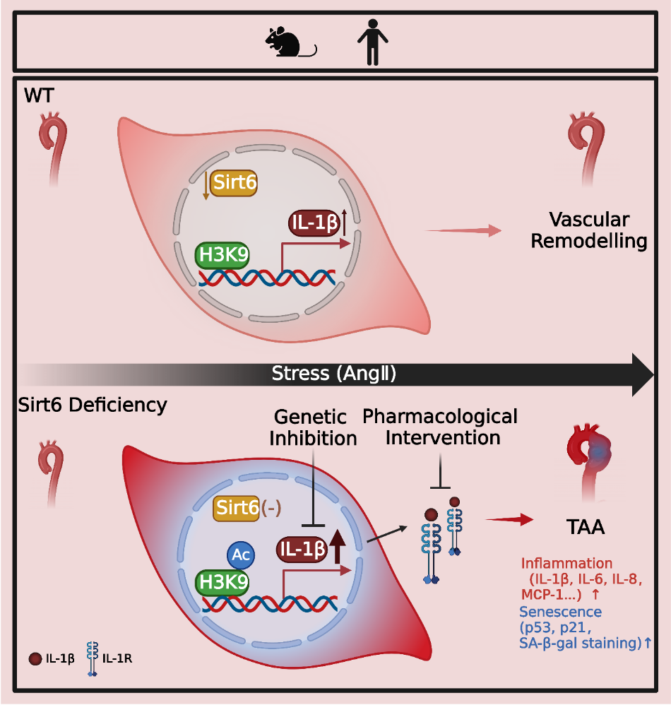 该研究发现SIRT6在临床散发型TAA样本中膜表达显著降低。血管紧张素II(Angiotensin II, Ang II)刺激促进血管平滑肌SIRT6敲除小鼠TAA的形成及破裂,增加其死亡率以及血管炎症和衰老。生物信息学及生化分析发现以IL-1β为核心的炎症反应是SIRT6缺失导致TAA形成的关键早期因素。SIRT6通过去乙酰化IL-1β启动子区域H3K9和H3K56的乙酰化水平转录调控IL-1β的表达,进而影响血管炎症、衰老以及TAA的形成。该研究揭示了去乙酰化酶SIRT6抑制血管炎症和衰老预防TAA,为散发型TAA的防治提供了表观干预策略。