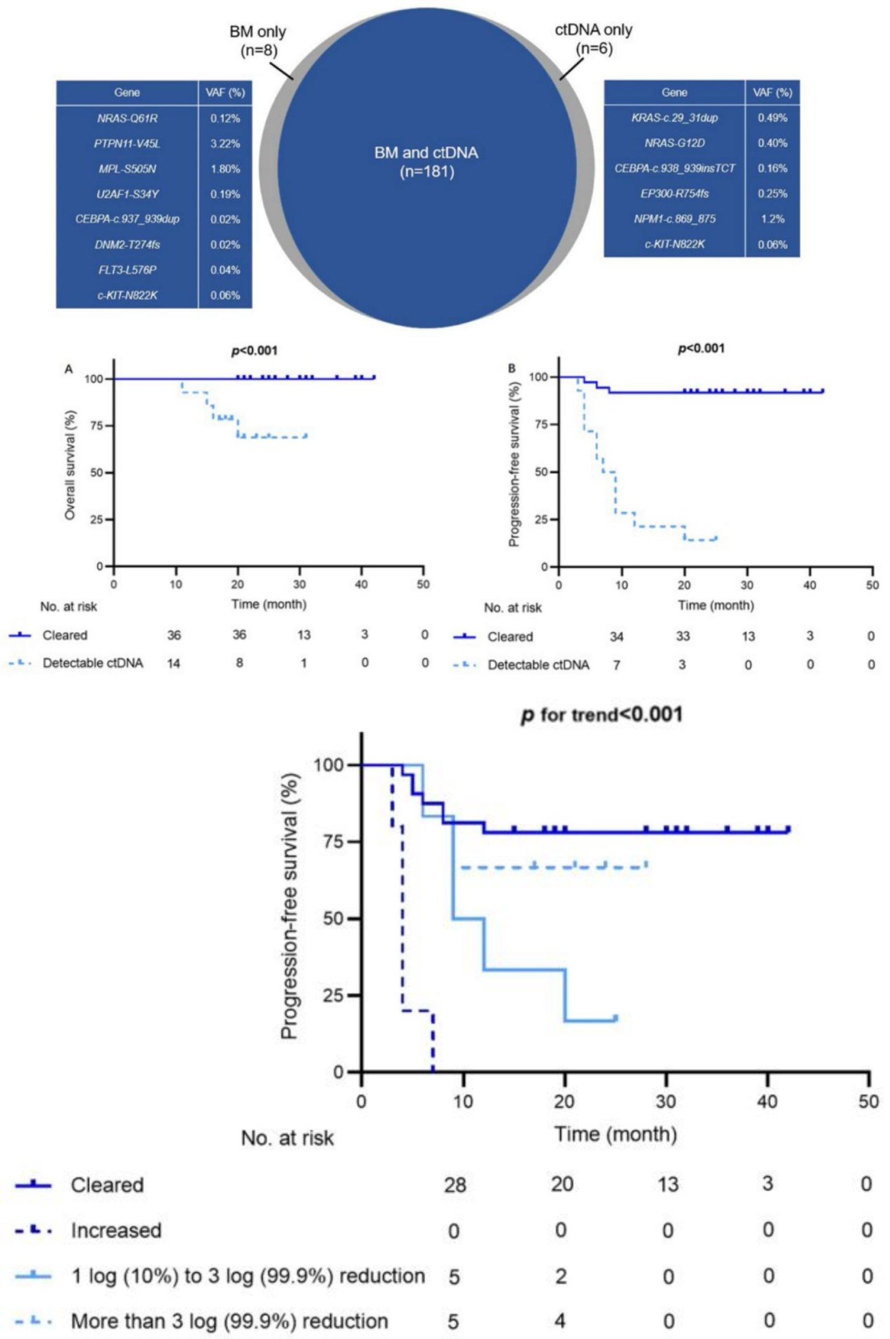 该研究纳入了50例初诊AML患儿,所有患儿在初诊及后续3个周期的化疗开始前的4个时间点,同时进行了骨髓流式细胞学检测(MFC)、骨髓肿瘤基因二代测序(NGS)及外周血ctDNA检测。结果表明,外周血ctDNA检测与NGS方法检测的骨髓肿瘤基因种类及突变频率的一致率高达92.8%,ctDNA突变丰度与MFC方法检测的MRD水平也具有显著相关性。