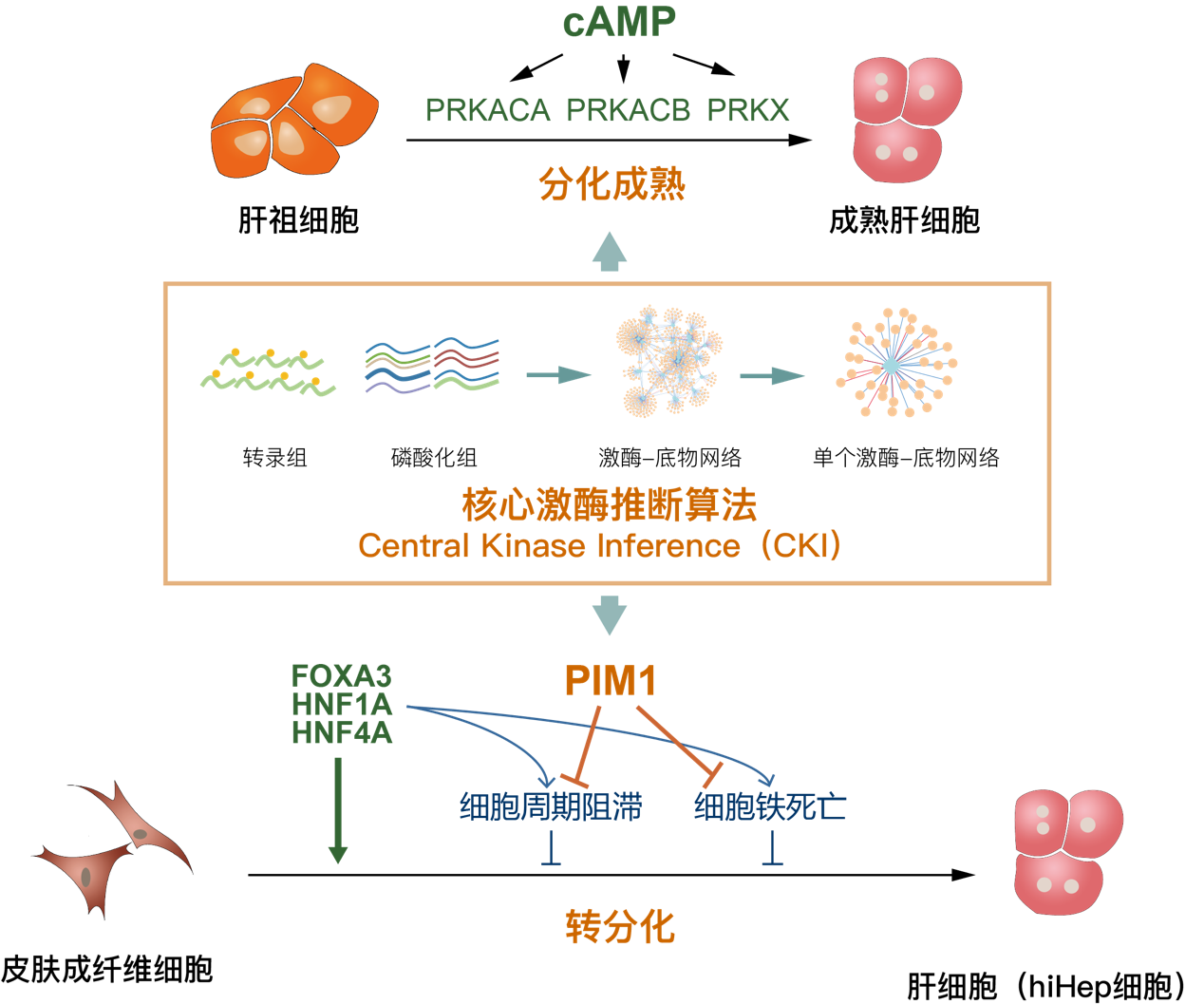 肝细胞在药物评价、细胞治疗、生物人工器官等领域具有重要的应用价值。然而,如何高效获取具有成熟功能的肝细胞一直是瓶颈问题。本研究团队基于CKI算法预测出PIM1是肝向转分化的关键调控激酶(图一)。进一步研究发现过表达PIM1可以抑制细胞命运转变导致的细胞周期阻滞和细胞铁死亡,从而大幅提高肝向转分化的效率,并能显著促进转分化肝细胞的成熟。这项工作利用CKI算法也发现了双分化潜能的小鼠肝祖细胞在向成熟肝细胞分化过程中,环磷酸腺苷(cAMP)通过蛋白激酶C的激酶活性亚基(亚基、亚基)、X-连锁蛋白激酶等促进肝细胞成熟的机制。该项研究不仅为更高效地获取成熟的转分化肝细胞提供了关键的机制基础,也为多组学整合的重要激酶预测提供了高效的计算方法。