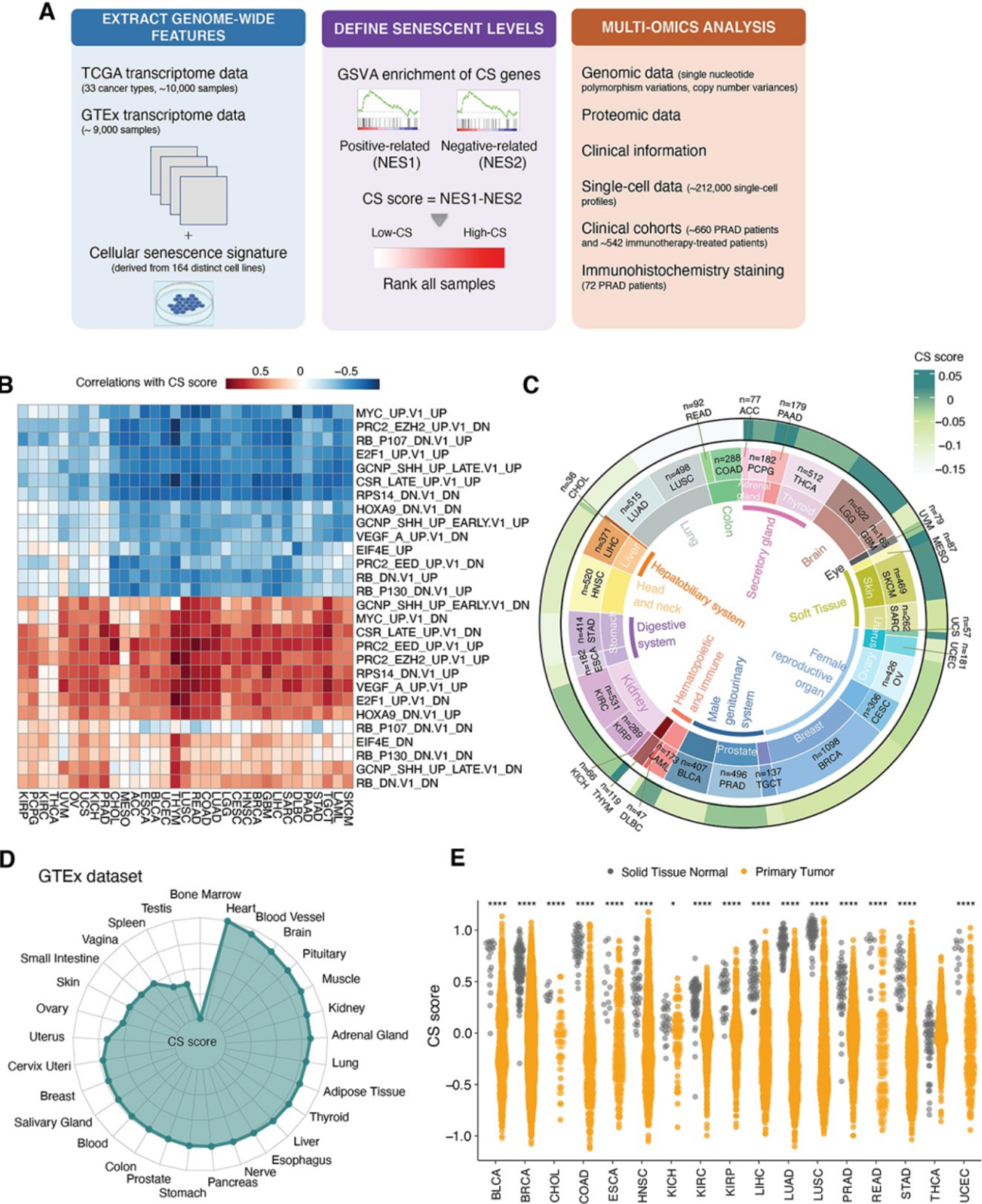 本研究团队通过整合164组人源细胞系的细胞衰老的共同特征,定义了cellular senescence (CS) score作为衰老水平的度量,并基于此描绘了33种癌症类型的细胞衰老景观(图1)。不同癌症展示出细胞衰老水平的组织特异性,且肿瘤组织的细胞衰老水平普遍低于正常组织。进一步对约20,000名癌症患者和212,000个单细胞的多组学数据分析表明,部分癌症的基因组不稳定性与CS score负相关,而免疫激活程度呈现出与细胞衰老水平的正相关,特别是在前列腺癌症中,细胞衰老水平更高的肿瘤倾向于拥有免疫激活的微环境。此外,本研究采用机器学习的算法,在前列腺癌症中筛选并验证和病人预后相关的关键衰老分子。对肿瘤中衰老水平的系统评估将有利于加深对衰老这一癌症新特征的理解。