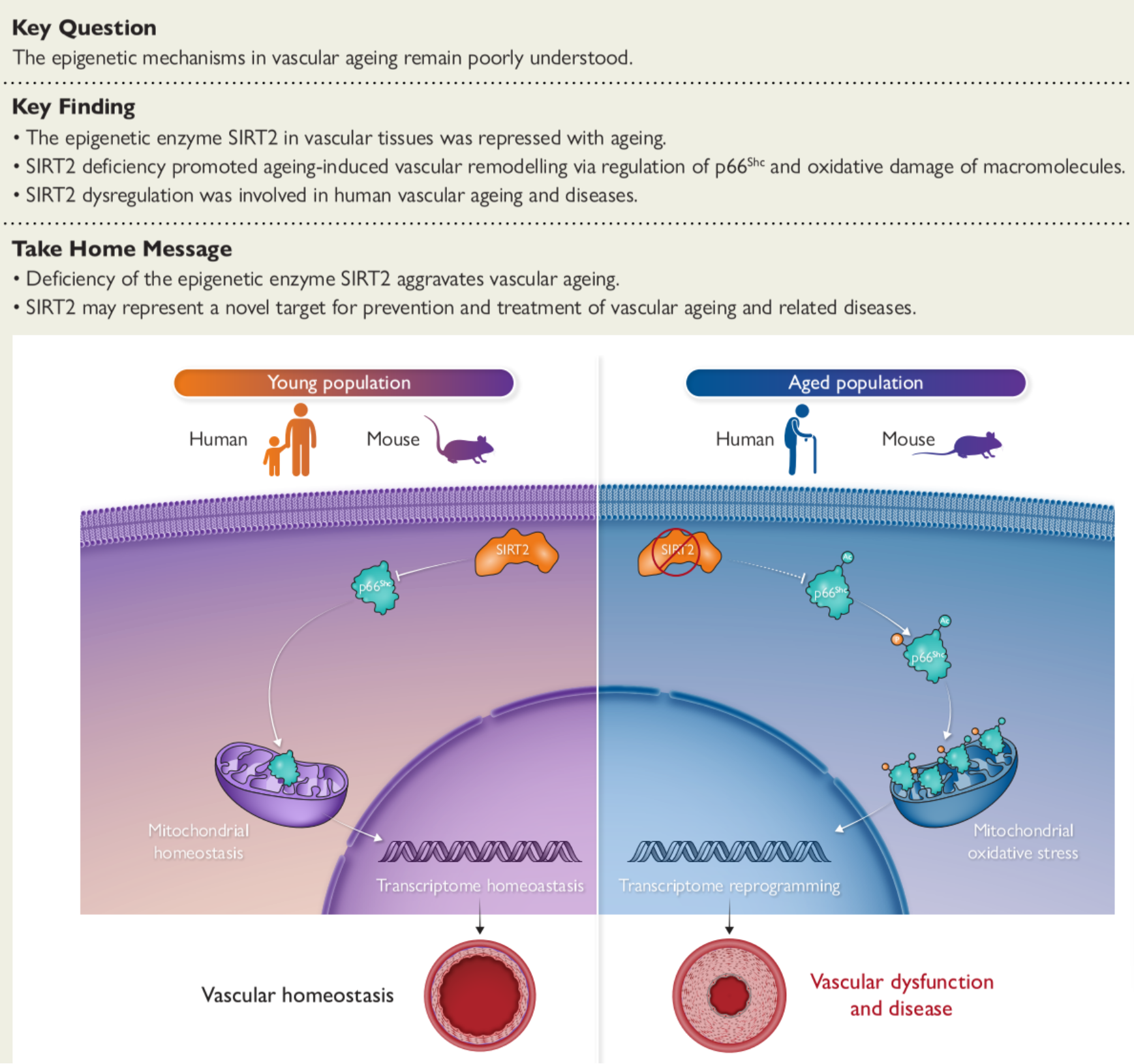 基于衰老人群和小鼠数据,该研究首次证明了SIRT2作为一种表观遗传调节因子可以通过细胞质-线粒体穿梭机制调控血管衰老。在人群和小鼠模型中,SIRT2及其共表达模块与衰老及衰老相关的血管疾病密切相关。在老年小鼠中,SIRT2缺失会加剧衰老诱导的动脉僵硬和收缩-松弛功能障碍,并伴有血管中膜的重塑。转录组学、生物信息学和生化分析显示,衰老控制蛋白p66Shc和线粒体活性氧(mROS)参与了SIRT2在小鼠和人群血管衰老和疾病中的功能。SIRT2通过在赖氨酸81位点去乙酰化p66Shc来抑制p66Shc的活化,从而调控血管细胞中线粒体氧化应激,进而重塑血管细胞转录组并抑制血管衰老。该研究阐明了去乙酰化酶SIRT2抑制血管衰老的重要功能,首次在衰老动物和人群中揭示了内源性表观调控因子在血管衰老中的关键作用及机制。