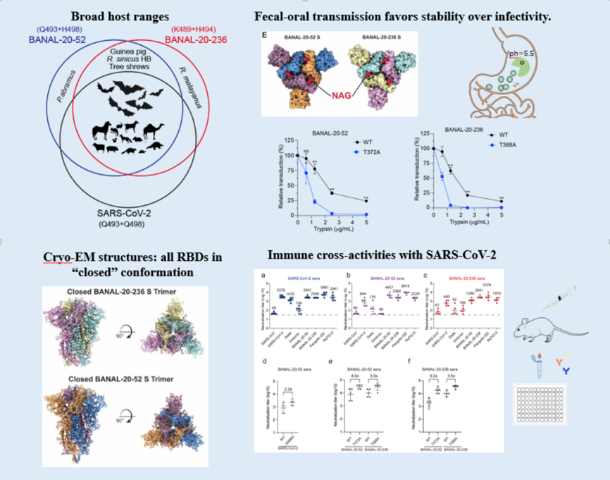 2023年7月28日,beat365手机版官网病原生物学研究所钱朝晖团队和中国科学院生物物理研究所王祥喜团队合作在Cell Discovery《自然发现》期刊上发表了题为“Host susceptibility and structural and immunological insight of S proteins of two SARS-CoV-2 closely related bat coronaviruses”(两种新冠样蝙蝠冠状病毒S蛋白的宿主易感性、结构以及免疫学研究)的研究论文,对2种于2020年在老挝发现的、与SARS-CoV-2高度同源的蝙蝠冠状病毒BANAL-20-52和BANAL-20-236 S的潜在宿主范围、S蛋白的结构以及免疫特征进行了较系统的研究。