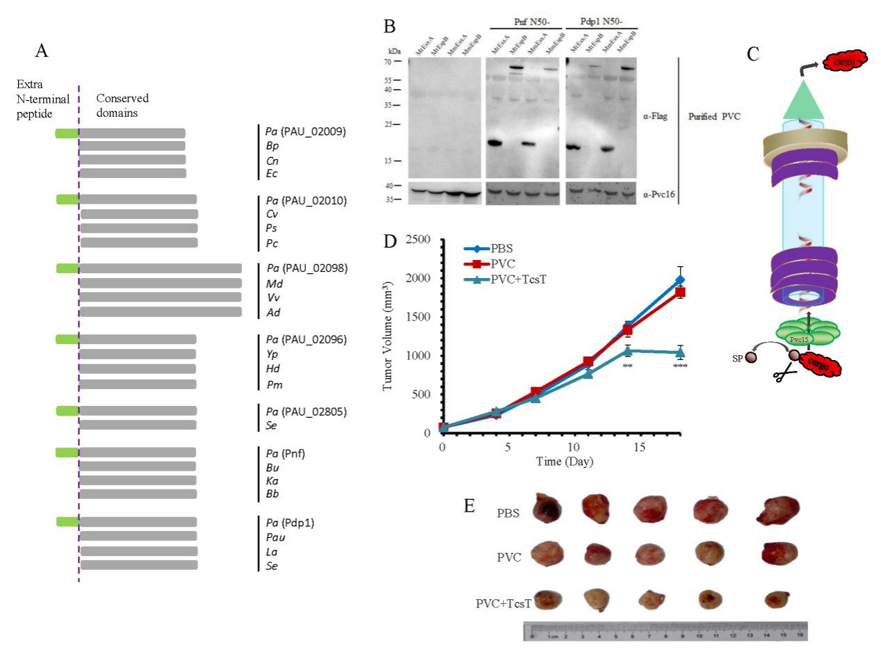 该项工作通过对PVC毒力因子的序列分析发现,一段特异性信号肽编码在其N端,且在毒力因子装配入PVC复合物中发挥了关键的作用。随后通过人工设计的方法,成功将包括结核分枝杆菌七型分泌系统T7SS毒力因子在内的多个原核及真核来源蛋白装载入PVC复合物内筒中,并递送至真核细胞中发挥其生理功能。研究工作还发现,pvc基因簇中的一个ATPase家族蛋白Pvc15能识别上述N端信号肽并协助装载蛋白的转运。最后通过装载一类细胞致死因子,该PVC装置被成功应用于荷瘤小鼠的精准治疗实验,显著抑制了小鼠体内肿瘤细胞的生长。该研究不仅鉴定了一类N端信号肽的作用机理,揭示了它们在PVC复合物蛋白装载过程中的关键功能,还成功将此装置应用于精准肿瘤靶向治疗的研究。这些工作为后续深入改造PVC相关结构为高效的药物递送系统奠定了坚实的基础。