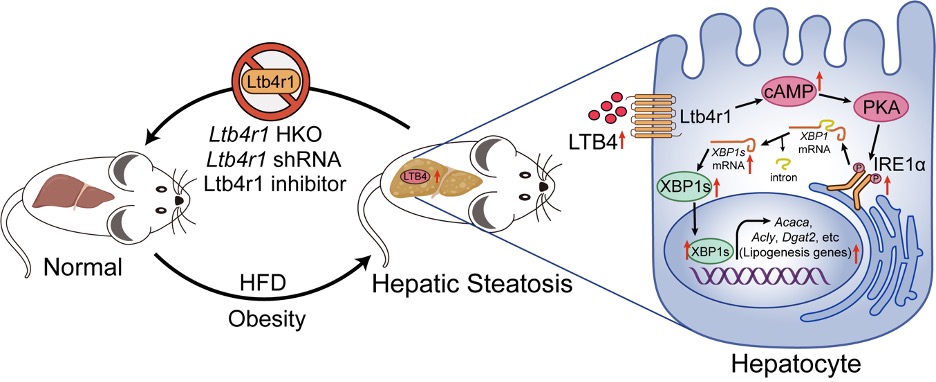 本研究团队首次发现LTB4/Ltb4r1在肝细胞能直接促进肝细胞脂质从头合成。在饮食诱导或遗传因素导致的肥胖小鼠模型中,肝细胞特异性Ltb4r1敲除(Ltb4r1 HKO)则显著改善小鼠肝脏脂质堆积及血脂异常。分子机制研究表明,LTB4/Ltb4r1提高肝细胞内环磷酸腺苷(cAMP)水平进而激活蛋白激酶A(PKA),PKA则激活内质网应激通路IRE1α-XBP1后促进脂质合成基因的转录,进而升高细胞内甘油三酯水平。采用慢病毒Ltb4r1-ShRNA 或Ltb4r1抑制剂均明显改善肥胖小鼠的脂肪肝表型。本研究为阐释NAFLD发生提供新机制及潜在治疗靶标。