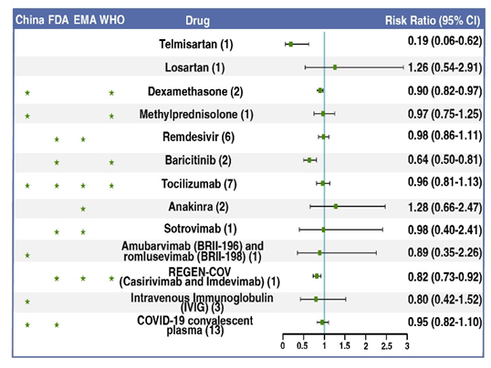 图:11种推荐药物以及替米沙坦、氯沙坦降低新冠住院患者28/30天死亡率的效果
