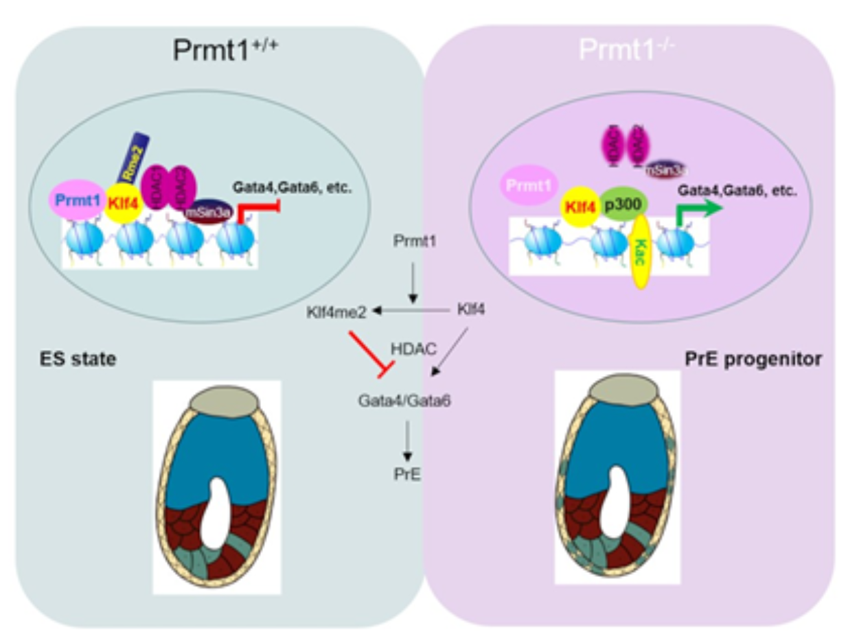 哺乳动物胚胎发育早期的第二次细胞命运决定至关重要。然而,其潜在的分子机制在很大程度上尚未探明。本研究发现蛋白质精氨酸甲基转移酶家族成员Prmt1是PrE形成的重要调节因子。Prmt1基因缺失促进了小鼠胚胎干细胞(mESC)中PrE基因的表达。单细胞RNA测序和流式细胞术等分析表明,Prmt1的敲除导致mESC中形成一个新兴的细胞集群,其中PrE特征基因显著上调;Prmt1敲除显著增加了胚外内胚层细胞(XEN)的诱导效率。分子机制研究发现,Klf4是Prmt1特异的底物分子,Prmt1特异性甲基化修饰Klf4分子396位精氨酸,这是募集抑制性mSin3a/HDAC复合物进而沉默PrE基因所必需的。小鼠胚胎嵌合试验表明,Prmt1甲基化活性抑制或者Klf4的Arg396突变均可诱导mESC整合到PrE谱系中。