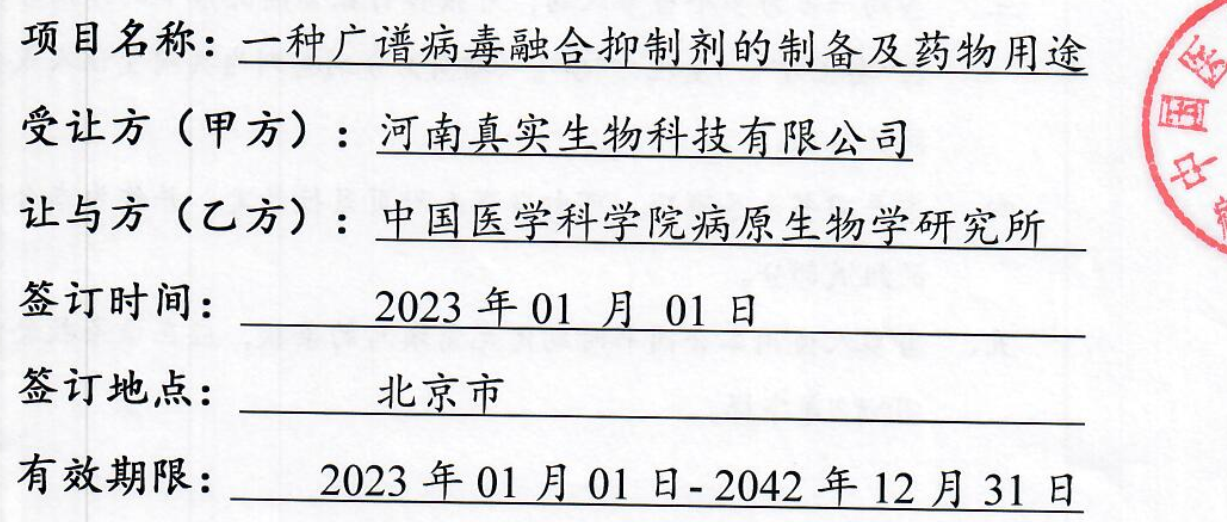 十二、病原生物学研究所转让“一种广谱病毒融合抑制剂的制备及药物用途 ”(成果转化)