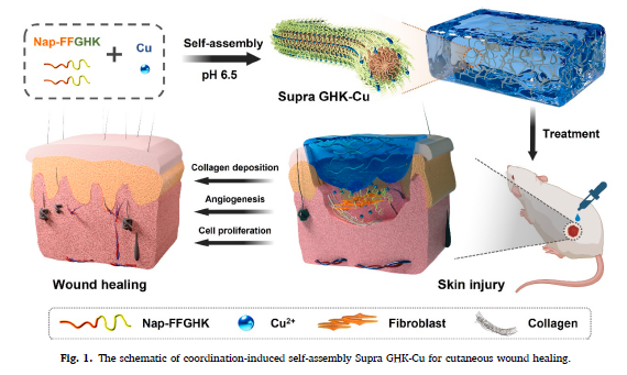 成果简介:受生命中金属离子对蛋白质结构和功能的调控的启发,金属配位在肽的折叠和组装中的作用逐渐被研究。然而,构建具有金属配位和肽自组装协同作用的生物活性超分子金属肽仍然具有挑战性。该研究报道了一种具有天然来源的GHK三肽基序的仿生肽衍生物,加入Cu2+后可以自组装成超分子金属肽水凝胶(Supra GHK-Cu)。Cu2+通过桥接两个肽分子或与一个肽分子相互作用而对Supra GHK具有更强的亲和力。由于超分子结构的形成,Supra GHK-Cu对蛋白酶降解具有出色的抵抗力。此外,它通过促进胶原蛋白沉积、血管生成和细胞增殖,比 GHK-Cu 更显著地加速伤口愈合。这项工作不仅体现了一种成功的仿生超分子金属肽水凝胶,而且还提供了一种有希望的替代策略来克服传统生物活性肽在各种生物医学领域的局限性。