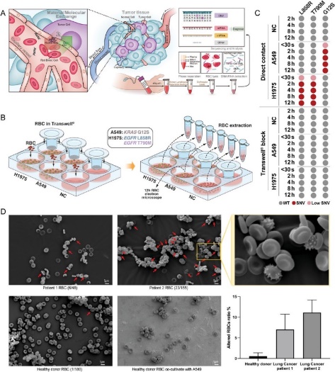 成果简介:红细胞的主要功能是运输氧气、二氧化碳及其他代谢产物,其在发育成熟过程中会将细胞核和线粒体排出。成熟红细胞中是否含有DNA片段尚缺乏明确的直接证据。考虑到肿瘤细胞早期发展阶段会大量招募红细胞为其生长提供支持,极有可能影响到红细胞本身并使其成为新的诊断目标。为了证明这一猜想,研究者通过直接接触和Transwell透膜分隔开等两种方式构建了体外共培养的系统,并且在不同时间点重新收集分离红细胞。结果表明在短暂的直接接触之后,红细胞即获得了对应细胞系的突变DNA片段,而非直接接触组则不会。之后,研究团队尝试在早期肺癌患者的红细胞中检测EGFR、KRAS等最常见的突变位点,并与手术切除的肿瘤组织进行比较。结果表明,利用红细胞的DNA进行突变的检测具有极高的灵敏性和包容性。该研究首次证实了人类成熟红细胞中含有长片段的DNA,提示红细胞可参与到早期肿瘤的发生发展中,基于红细胞的新型液体活检技术在肿瘤早筛和诊断领域具有广阔的应用前景。
