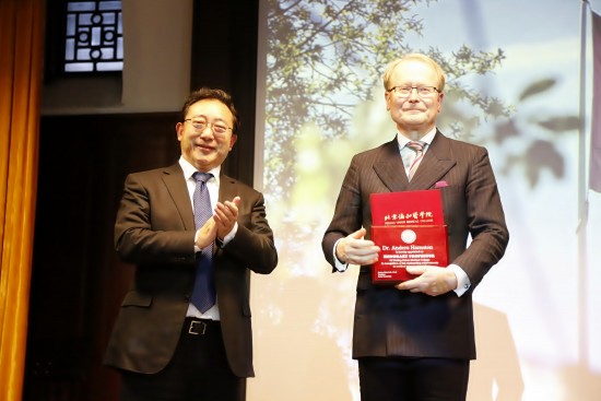 为了表彰Hamsten教授为中国与瑞典医学合作及心血管疾病研究做出的卓越贡献,曹雪涛院校长代表院校授予Hamsten教授“beat365手机版官网名誉教授”称号,并颁发荣誉证书,希望他继续积极推动中-瑞医学科学的交流与合作,为世界医学科学的发展做出贡献。
