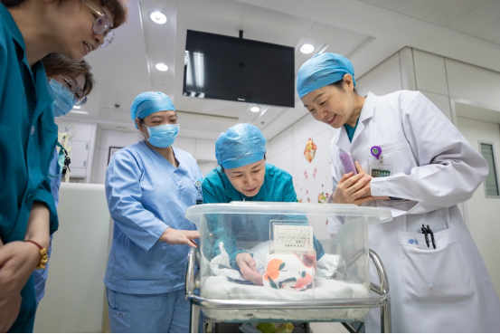 ▲郎景和院士与樊庆泊主任医师为新生儿做检查