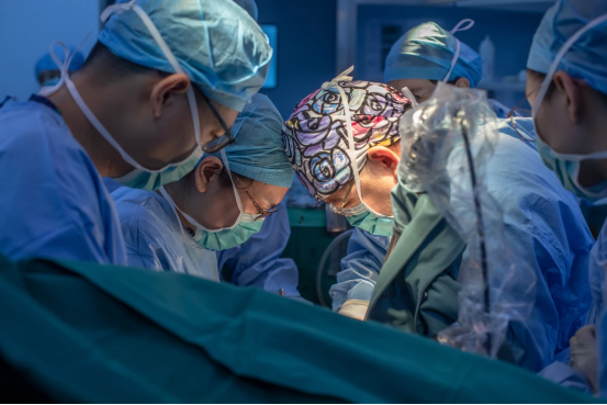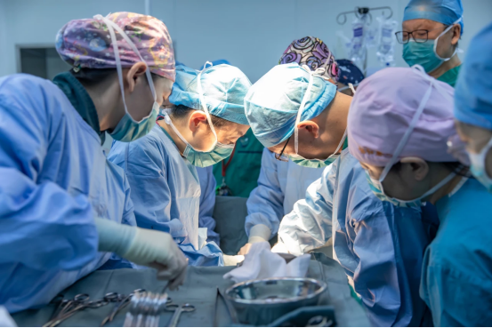 ▲樊庆泊(左三)团队与陈跃鑫(左二)团队在手术中