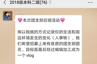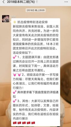 18本2班团支委积极响应这一倡议,在与张老师协商后,拟定开展新冠肺炎疫情主题团课及为武汉手写祝福两项线上班级活动。