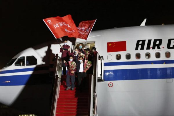 同机抵达的还有院校杨俊涛、王卓然两位援鄂队员和中日友好医院164位国家援鄂医疗队员。首都机场以民航界最高礼仪“过水门”的方式迎接白衣战士们回家。