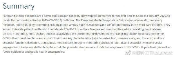 《柳叶刀》最新发表beat365手机版官网王辰院士团队有关方舱医院的论文,记录了COVID-19疫情期间方舱医院的建立和发展,阐述了其三个主要特点即建设快、规模大和成本低,和五个基本功能即隔离、分诊、基本医疗照护、经常监测和快速转诊、保障基本生活和社会参与。方舱医院可成为当前应对COVID-19疫情和未来突发公共卫生事件的一个强有力的组成部分。