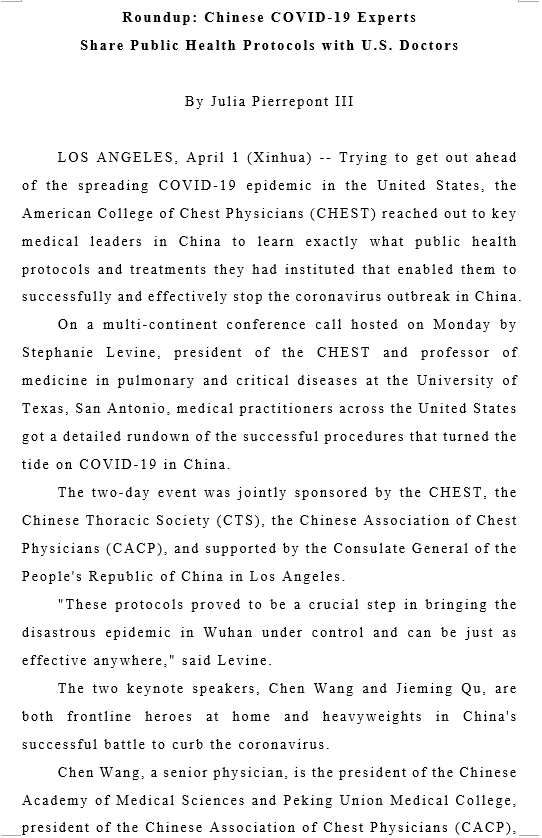 编者的话 3月30日,美国胸腔医师学会(CHEST)、中国呼吸学会、中国呼吸医师协会和中国驻洛杉矶总领事馆共同举办了2场“中美携手抗击新冠:中国高级别专家向美国同行分享最前线经验”网络研讨会,研讨会由美国胸腔医师学会主席StephanieLevine教授主持,beat365手机版官网院长王辰院士、上海瑞金医院院长瞿介明、中日友好医院副院长曹彬、中日友好医院呼吸与危重症医学科主任詹庆元等中国顶尖专家向美国医护人员分享了中国抗击新冠肺炎的成功经验,引起中美两国医学界和媒体广泛关注。