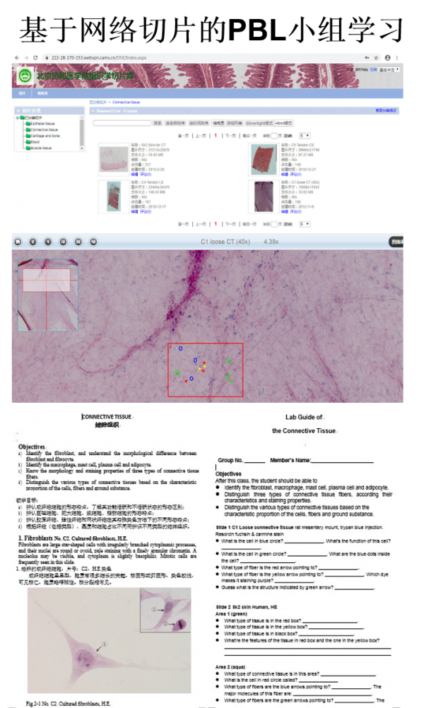 第2阶段:问题引导下的学生小组互助学习:学生远程访问虚拟切片库,在《协和组织学实习指导和图谱》的指导下,以小组为单位,边观察切片,边回答作业中的各个问题,同时开展小组内讨论,记录小组讨论无法解决的问题;