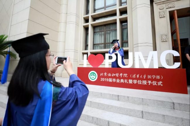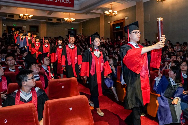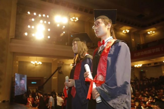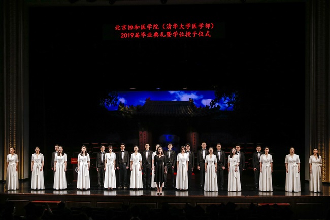 雨燕合唱团深情合唱校歌《协和颂》,以大家耳熟能详的旋律和歌声,表达了医者的责任担当和毕业生对母校的眷恋不舍。在悠扬的歌声中,2019届优秀毕业生手持象征学业表彰的“文海奖牌”,身着学位服井然有序地步入会场,重现百年协和毕业典礼的经典场景。