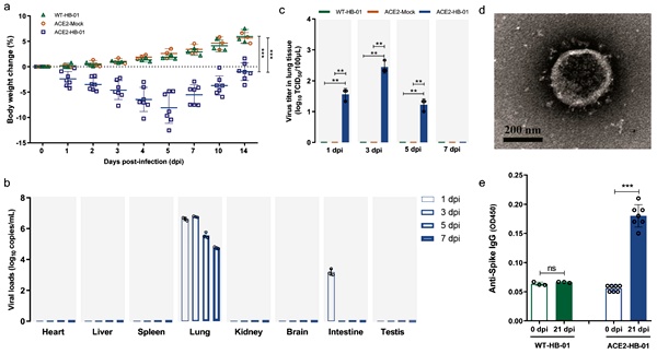 图1. SARS-CoV-2感染hACE2转基因小鼠后,动物出现了体重下降,病毒主要在肺组织内复制,肺组织可检测到高水平的病毒载量、病毒滴度与病毒颗粒,感染引发机体产生了特异的IgG