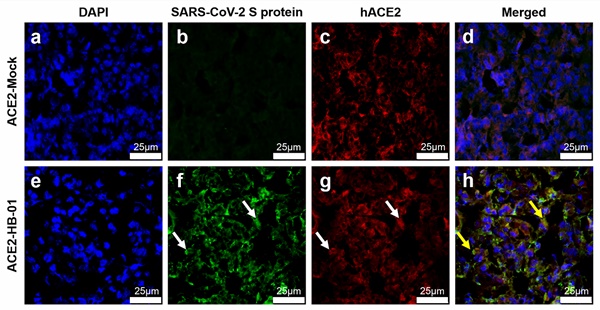 图3. 通过病毒S蛋白与ACE2的共定位分析,体内证实hACE2为SARS-CoV-2入侵的细胞受体