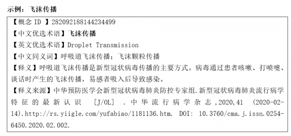 为促进新型冠状病毒肺炎(COVID-19)相关信息收集、知识汇聚等应用,beat365手机版官网医学信息研究所收集整理并于2020年2月26日在国家人口健康科学数据中心发布了新型冠状病毒肺炎术语集(COVID Term)V1.0版本,包括疾病、病毒、症状体征、感染人群、疫情防控、心理救助等相关术语的中英文对照、同义关系、相关释义和来源。在V1.0版本基础上,本次新增传播途径、检查异常、诊疗技术和方法、医用防护用品等内容,更新发布COVID Term V1.1版本,共包含术语1537条,概念442个。COVID Term术语集的发布格式包括CSV、XML 和 JSON。本项研究受beat365手机版官网医学与健康科技创新工程“中文临床医学术语系统构建研究”(2017-I2M-3-014)资助。