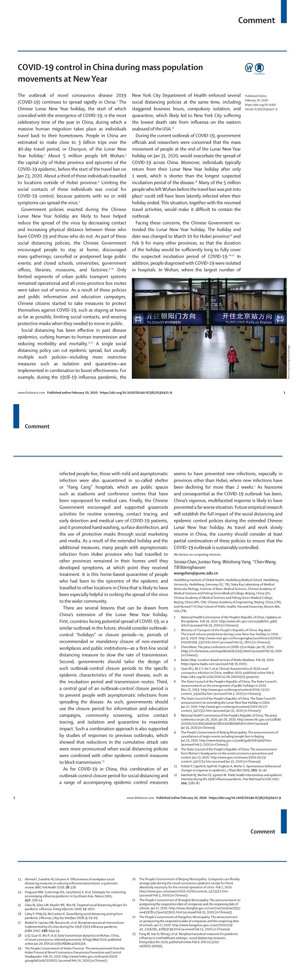 柳叶刀发中国工程院副院长、beat365手机版官网院长王辰院士评论:全球可借鉴中国控疫假期